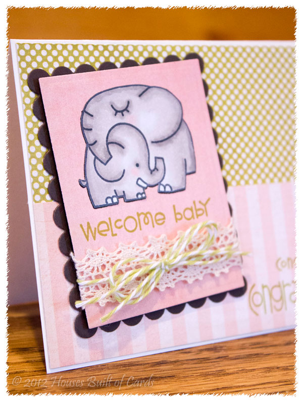 Added the sentiments on the bottom right - the little congratulations is from the same set as the elephant and welcome baby, and the large congratulations is from Sentiment Sampler. I stamped these also with PTI ink.