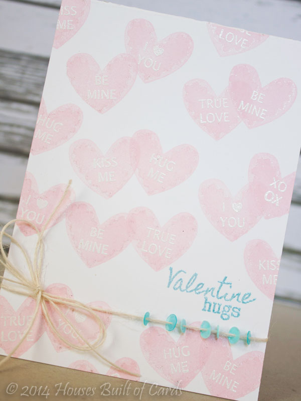 As soon as I saw the hearts from this set, I new I had to make a card with the candy hearts! I stamped the heart outline with My Favorite Things ink - nice and juicy and stamps perfect for these solid images! Then I stamped the "frosting" over the top in the same color ink, to leave a deeper color impression.