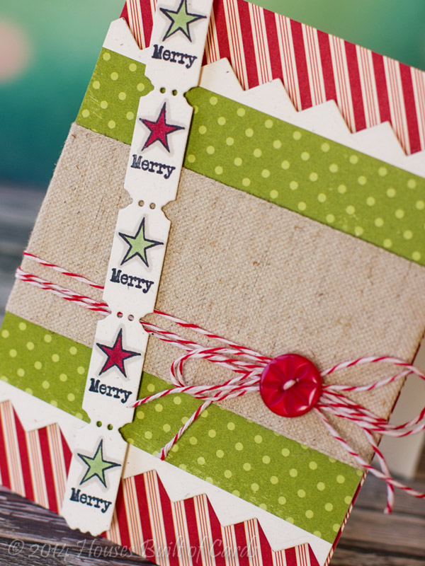 I added some fun pattern paper from October Afternoon, a zig zag border cut with Fancy Edges 2 Metal Dies, and a wrap of some lovely May Arts ribbon that I think looks a little like burlap, but much softer with a more linen texture. Finished off with some Cherry Red Traditional Baker's Twine and a little red button.