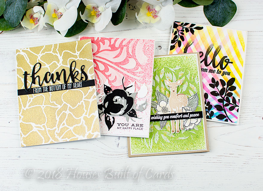 ReplyDeleteLovely cards. I love how you used the stencils to depict nature or abstract backgrounds on the different cards. They seem to go with every design idea.