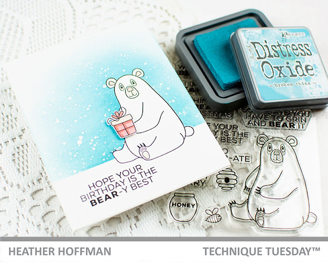 This little card ended up being nearly one layer. I started off by stamping the bear from the new Bobbi the Bear, and then stamping him again on masking paper, carefully fussy cutting out, then attaching over the top of the bear on my card base so I could add some ink blending behind him! I also used some tape along the bottom to mask a "ground" and added some white paint splatters before removing my mask.