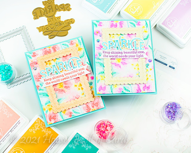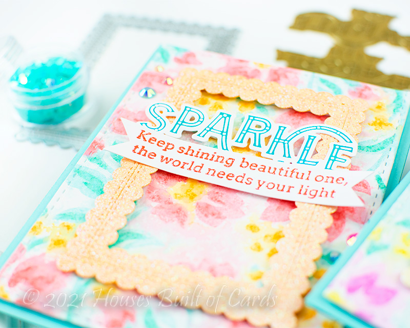For both cards I die cut the smaller Essentials: Stitched Scallop Rectangles from soft coordinating glitter cardstock - then ink blended over the top with coordinating ink to deepen the color. Did you know you could ink blend on glitter cardstock? It works beautifully! The sentiment is hot foiled from You Sparkle Hot Foil plate using Moondust hot foil, die cut with the coordinating dies, and then I just used the one word for this card, saving the other pieces for another card later.
