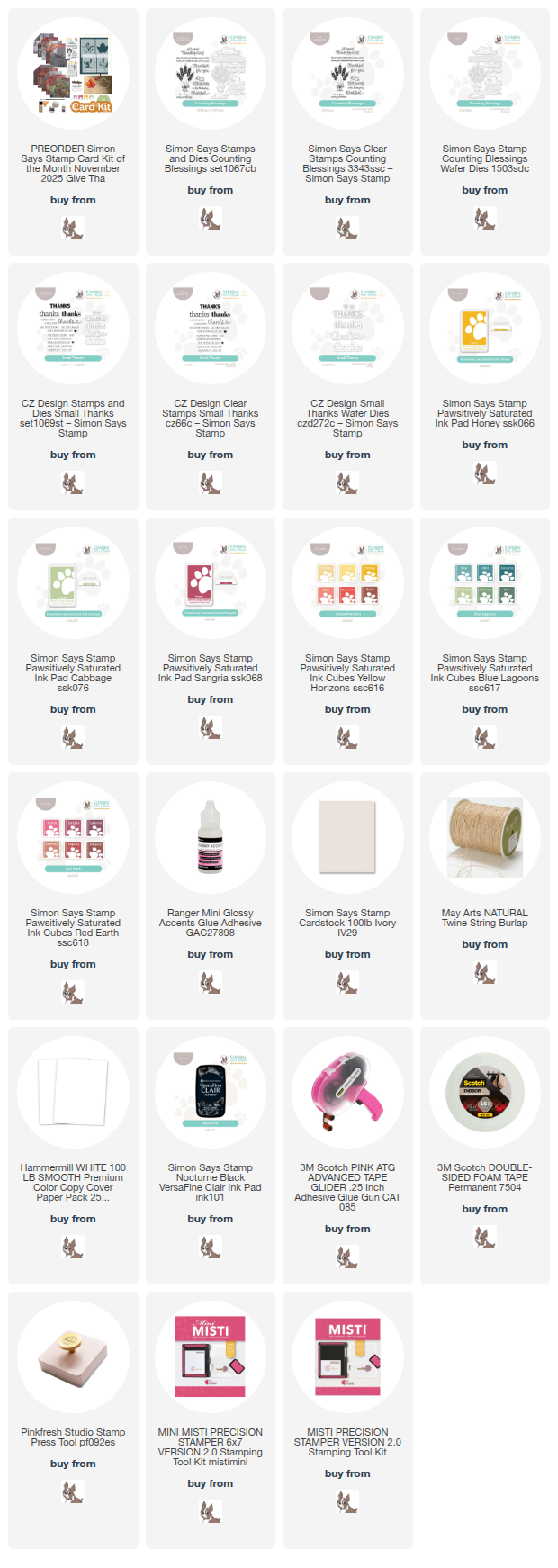 Hello! I'm popping in to share my first cards using the newest November 2025 Simon Says Stamp Card Kit - Give ThanksThis month's kit is perfect for the month of November with a theme of thankfulness! The included stamp set has a fun image and several great sentiments for combining, (there is a matching die set available HERE as well), and then another sweet mini sentiment stamp set as well (also with a coordinating die available HERE). There is an amazing layering stencil with coordinating die, and that's all not to mention the embellishments, ink cubes, cardstock, and more!