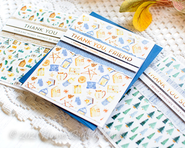 I started off by creating a set of thank you notes featuring the adorable pattern paper in the kit - and those pre-printed sentiments that I upgraded with copper hot foil! They are printed with toner, so work with Deco Foil - and I used my trick with the Pinkfresh Solid Hot Foil plate that I shared in this video HERE to add the foil. Check it out if you want to see how I did it!