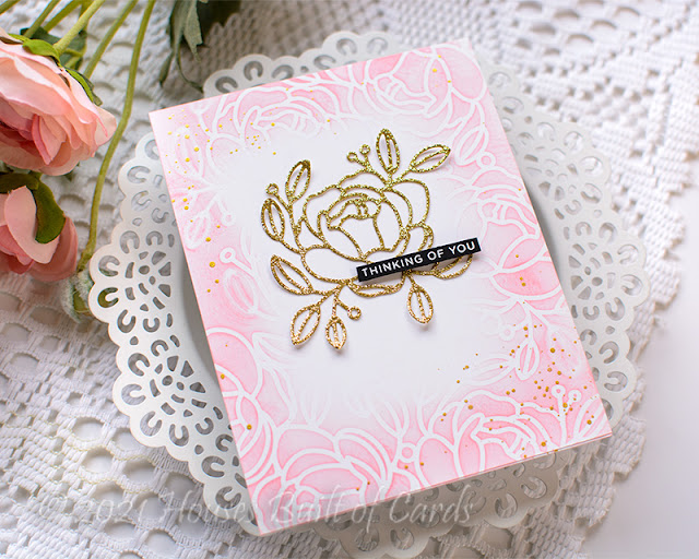 Next, I die cut the new Peony and Leaves die from gold glitter cardstock, and adhered it down with a bit of liquid glue in some of the key areas - leaving some of it floating a bit free for dimension.