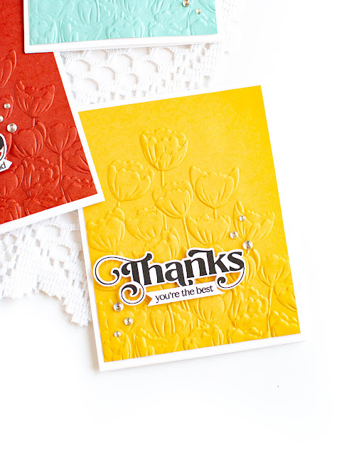 Hello! I'm stopping by today with another set of cards featuring some of the new Stamptember Release from Simon Says Stamp! This time I'm featuring a pretty new 3D embossing folder, paired up with some previously released sentiments. You may recognize the fonts on the sentiments - they are from the stamp set that coordinates with the hot foiled sentiments I used on THESE cards from a couple days ago!