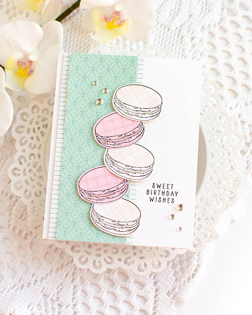 Hello! I'm popping in to share my first card using the newest June 2024 Simon Says Stamp Card Kit - Sweet Birthday! This month's kit has some fantastic sweet birthday images and sentiments! The included stamp set by the same name features cupcakes and macarons and lots of fun sentiments. There is also a coordinating die, fun embossing folder, lovely pattern paper, birthday sentiment die...that's all not to mention the cardstock, envelope, and more!