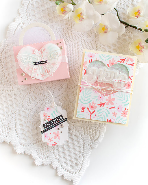 I started off with a different layered stencil set than they used - Layered Flowers - and a similar color palette. I added one color family, and grabbed a couple colors in a lighter tone than the ones they used for the class - Carnation, Apple, Cheeky, and Tidepool. I blended the entire panel on a large piece of white cardstock, then trimmed off enough to cut the largest Stitched Rectangle from. I die cut a Nested Round Heart from the center of that panel to create a shaker window. That was backed with a bit of white cardstock that I blended Cheeky and Tidepool ink onto, then filled with Pretty Pink Posh Iridescent Star Confetti. The sentiment was the Fancy Hello wafer die, cut from Champagne Glitter cardstock and vellum, and the tiny secondary sentiment was stamped from Hugs to You stamp set in Apple ink. Mounted that on a Cream cardbase, then added some Lawn Fawn White Hemp Twine tied around it. Moving on to the gift bag - that was die cut using the Gift Bag die from Cotton Candy cardstock. I used that stenciled heart from the card, and layered some vellum over top to soften it up a bit, then added the Rose Winged Butterfly, also die cut from Champagne Glitter cardstock (also used for the handles of the gift bag). Wrapped some May Arts Faux Silk ribbon around the bag, and added a few Dazzling Gems in clear and a tiny sentiment from Gratitude Reverse Sentiment Strips over the top! Finally, that tag was created with the final leftover strip from stenciling, layered over a bit of white cardstock, then die cut with the largest Label Tags wafer die. Added some of those same reverse sentiments over the top, and a few of the clear gems, as well as a bit of the white twine to the top to finish that one off! Here are more photos of all of these completed projects: