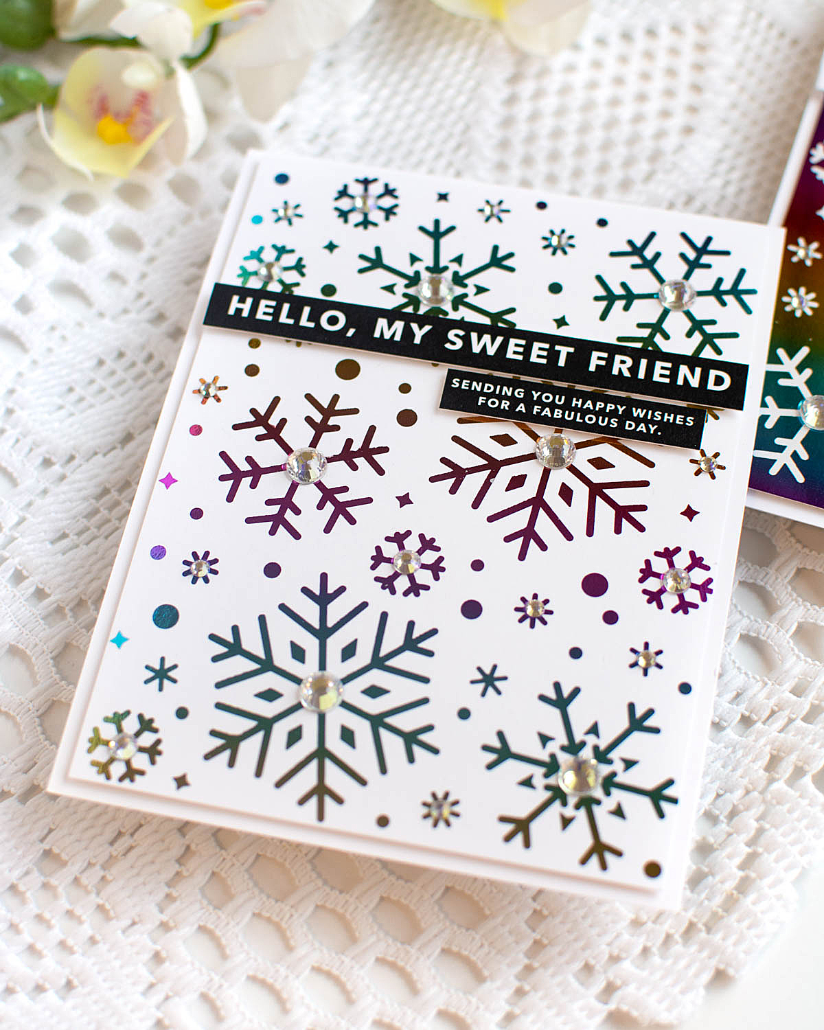 For these cards I used the Falling Snowflakes Foil Transfer sheets. These are toner based foiling - so they require the correct foil for that technique. While I don't have a laminator or a Minc machine to do this, I have found a trick that works with the Solid Hot Foil Plate from Pinkfresh. (You can watch a video HERE on my YouTube channel showing how this technique works - I want to do another video again soon sharing this trick with newer supplies, so watch for that someday soon!) Using that technique, I foiled the panel with Mystic Rainbow Decofoil. THEN...I used a White Toner sheet to foil the reverse image! What?!? My friend Lea told me about these - and I thought it was so cool! I trimmed the panels down, added sentiments from Everyday EZ Strips Sentiment Strips and Reverse Bold Hello Sentiment Strips, popped up on a bit of foam. Finished off with LOTS of Dazzling Gems in Prism for that extra touch of sparkle! Here are more photos of these cards - and my best attempt to capture the rainbow shine: