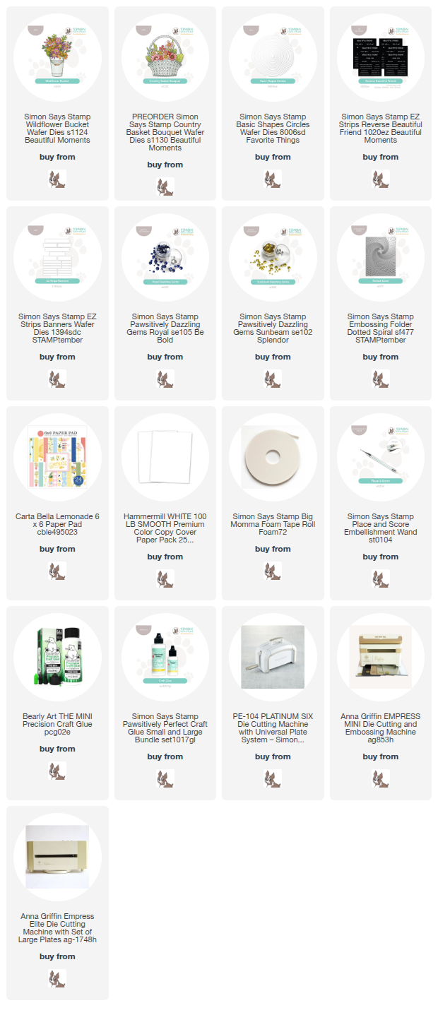 I started off with the circle of light blue pattern paper that was leftover from the window I cut in yesterday's card, and some extra florals and leaves from the same pattern paper and Wildflower Bucket and Country Basket Bouquet dies. I tucked them all around that die cut circle, adhering with liquid glue. I matted that on the larger die cut white circle - also leftover from yesterday's card! I added that onto a white panel embossed with the Dotted Spiral embossing folder, using the debossed side facing up. I added sentiments from Reverse Beautiful Friend EZ strips sentiment strips, trimming the larger sentiment in half and tucking it in from opposite sides. I finished off by embellishing the centers of the flowers with coordinating Dazzling Gems in Sunbeam and Royal. Here are more photos of the finished card: